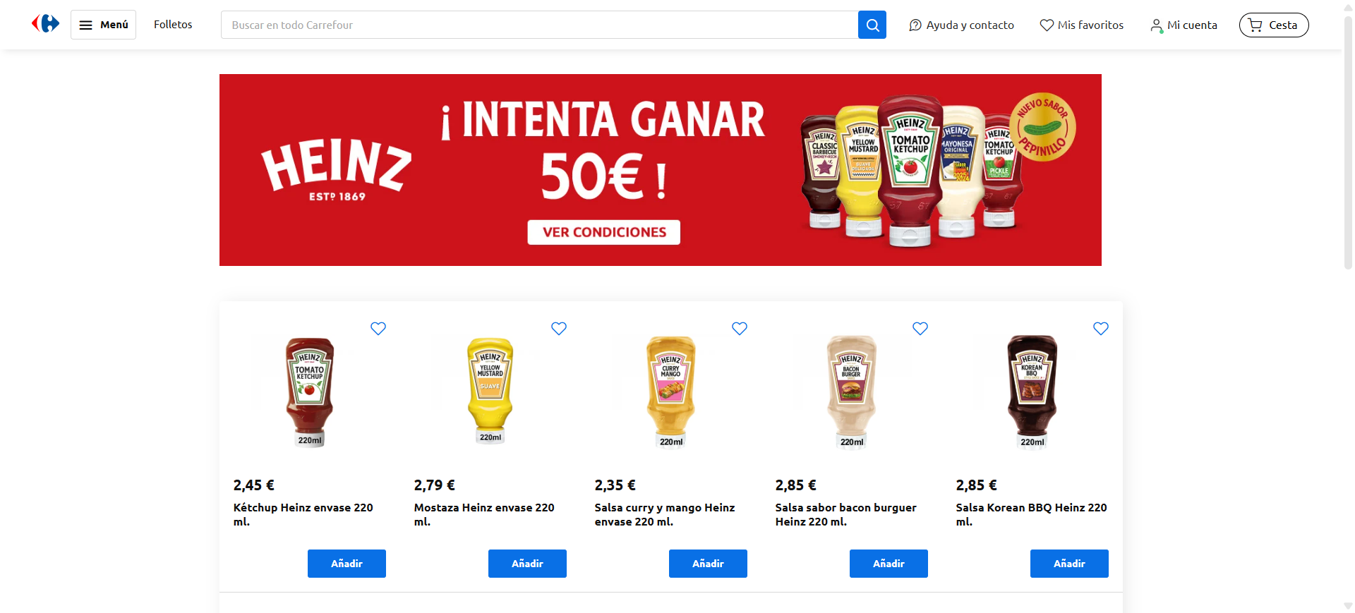 Pour répondre à son challenge de ventes incrémentales, la marque Heinz a pu bénéficier d’une visibilité maximisée, grâce aux emplacements gérés par Lucky cart sur le site de Carrefour.es.